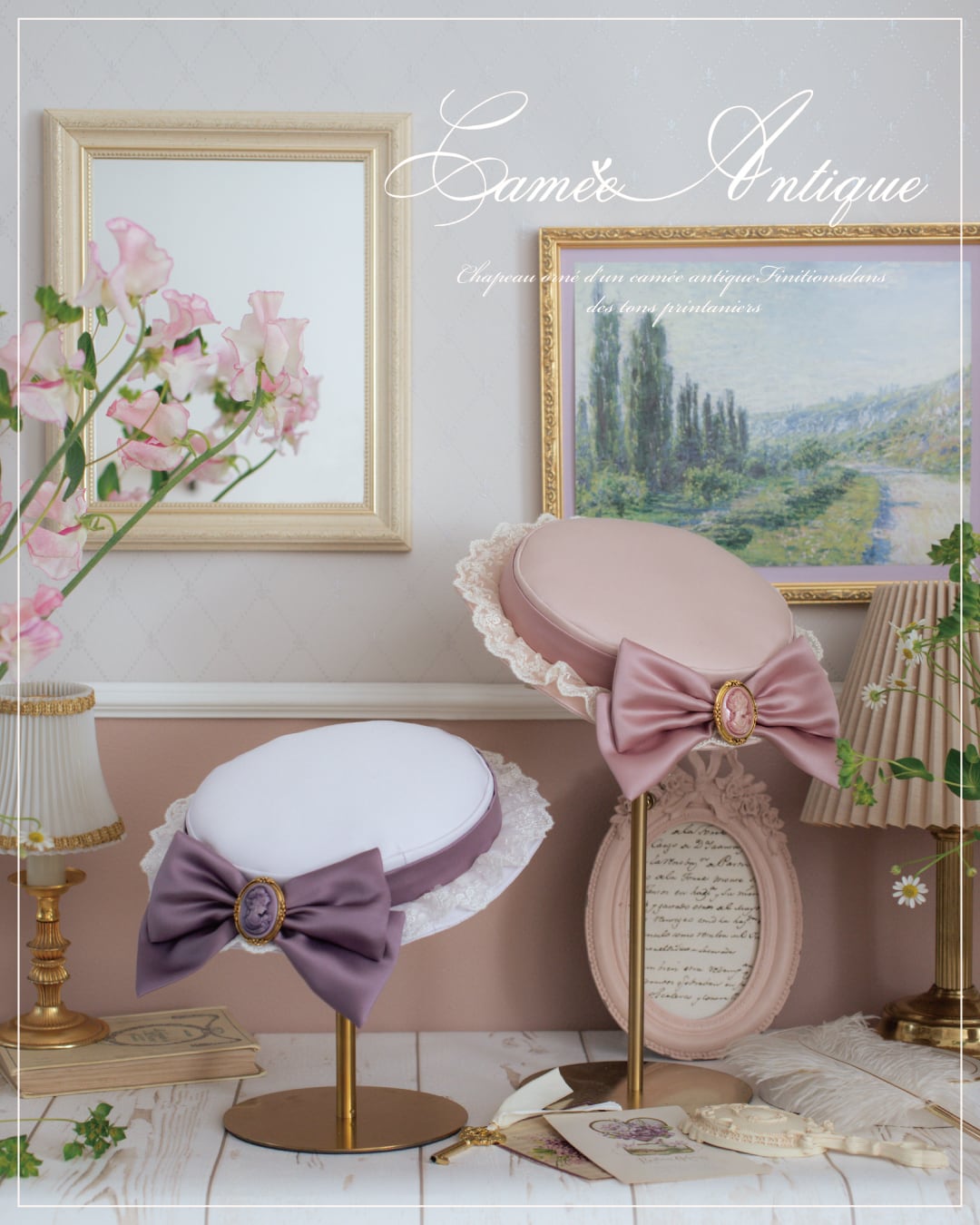 アンティーク感のあるカメオを使用した定番のシリーズ。 落ち着いたピンクのキャノチェに、くすみピンクのサテン生地でお作りしたリボンが付くデザイン。リボンの中心にピンクのカメオをあしらいました。 ブリムに施されたレースはベージュカラーで、よりアンティーク感のある色合いに仕立てました。 リボンが大きめなので、後ろにしてさりげなく、前にして可愛らしく、その日の気分や装いに合わせてアレンジしていただけます。 両サイドのコームで着脱する仕様です。 浅めのクラウンでお作りしているため、斜めに添えるように着用するデザインです。 サイズを問わずご着用いただけます。 …………………………………………………………… 【サイズ】 トップクラウン 17.5㎝ サイドクラウン 3㎝ ブリム 3㎝ 頭回り 52㎝