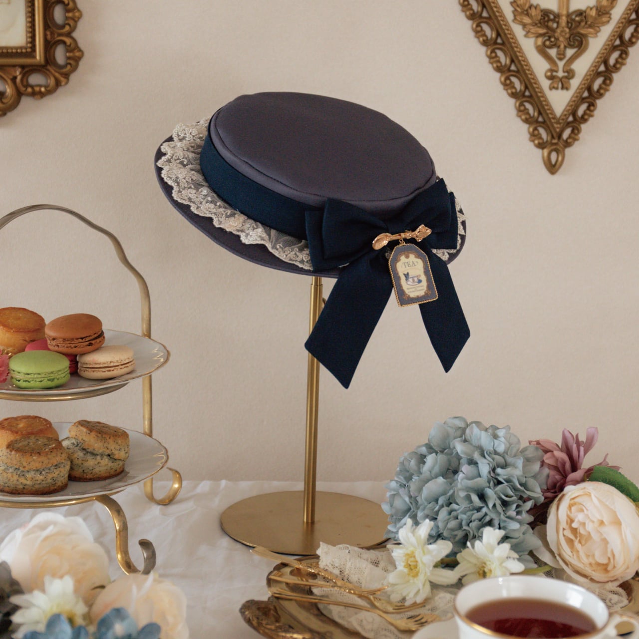 渋めのブルーのキャノチェに、ブリムにはアンティーク感のあるベージュのレースが施されています。