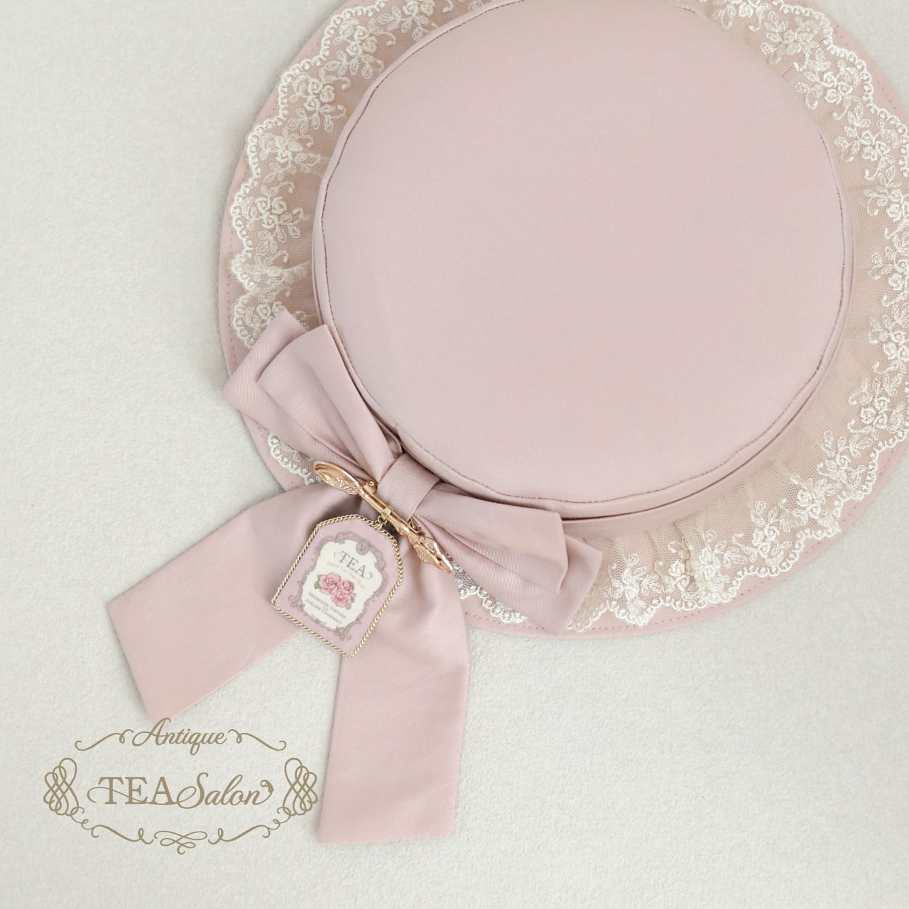落ち着いたピンクのキャノチェに、ブリムにはアンティーク感のあるベージュのレースが施されています。