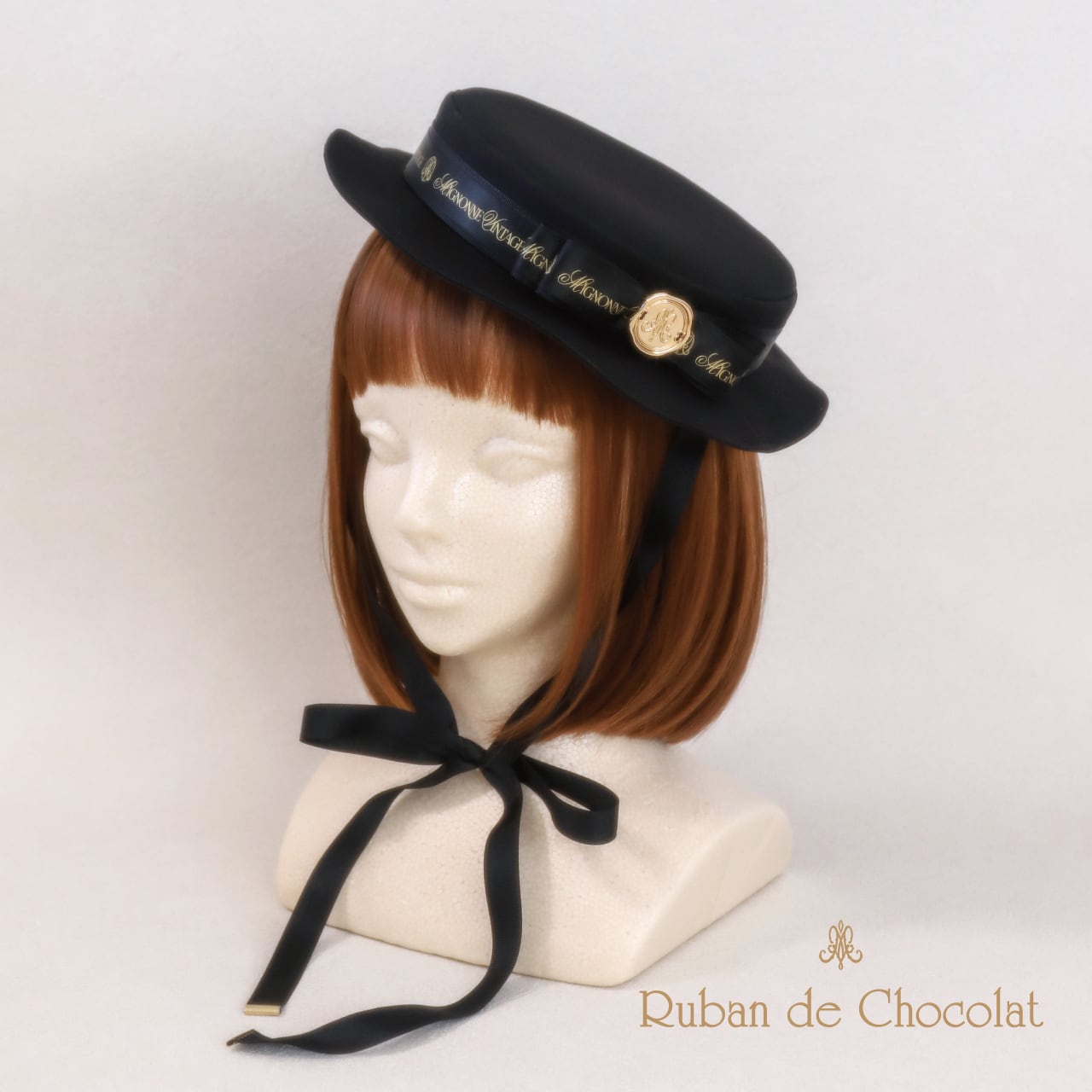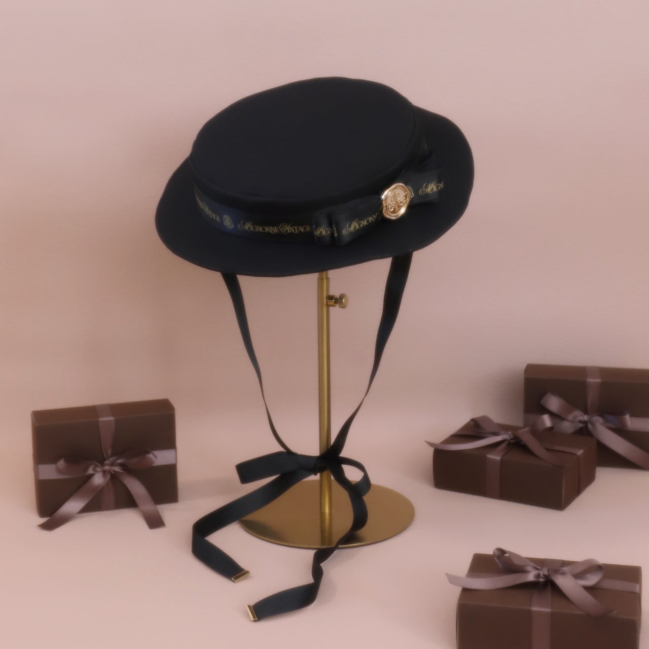同色のグログランテープに、Mignonne Vintageオリジナルのロゴテープを重ねたリボンをあしらいました。