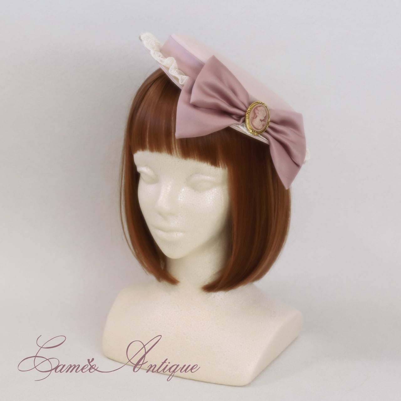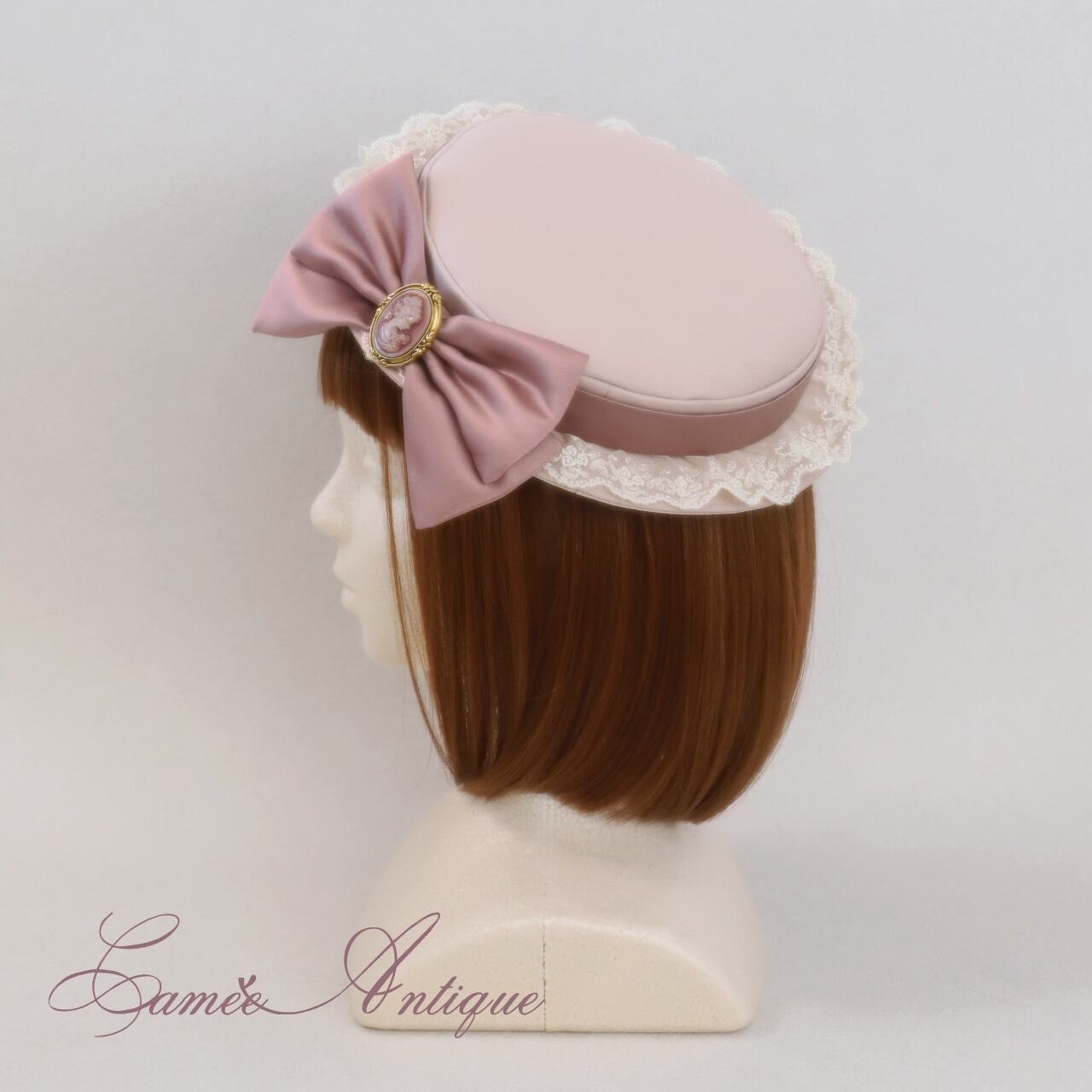 落ち着いたピンクのキャノチェに、くすみピンクのサテン生地でお作りしたリボンが付くデザイン。リボンの中心にピンクのカメオをあしらいました。