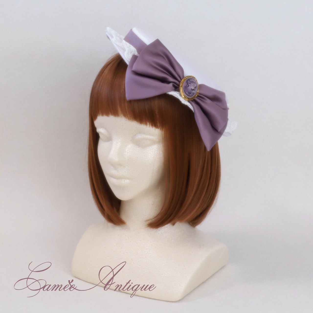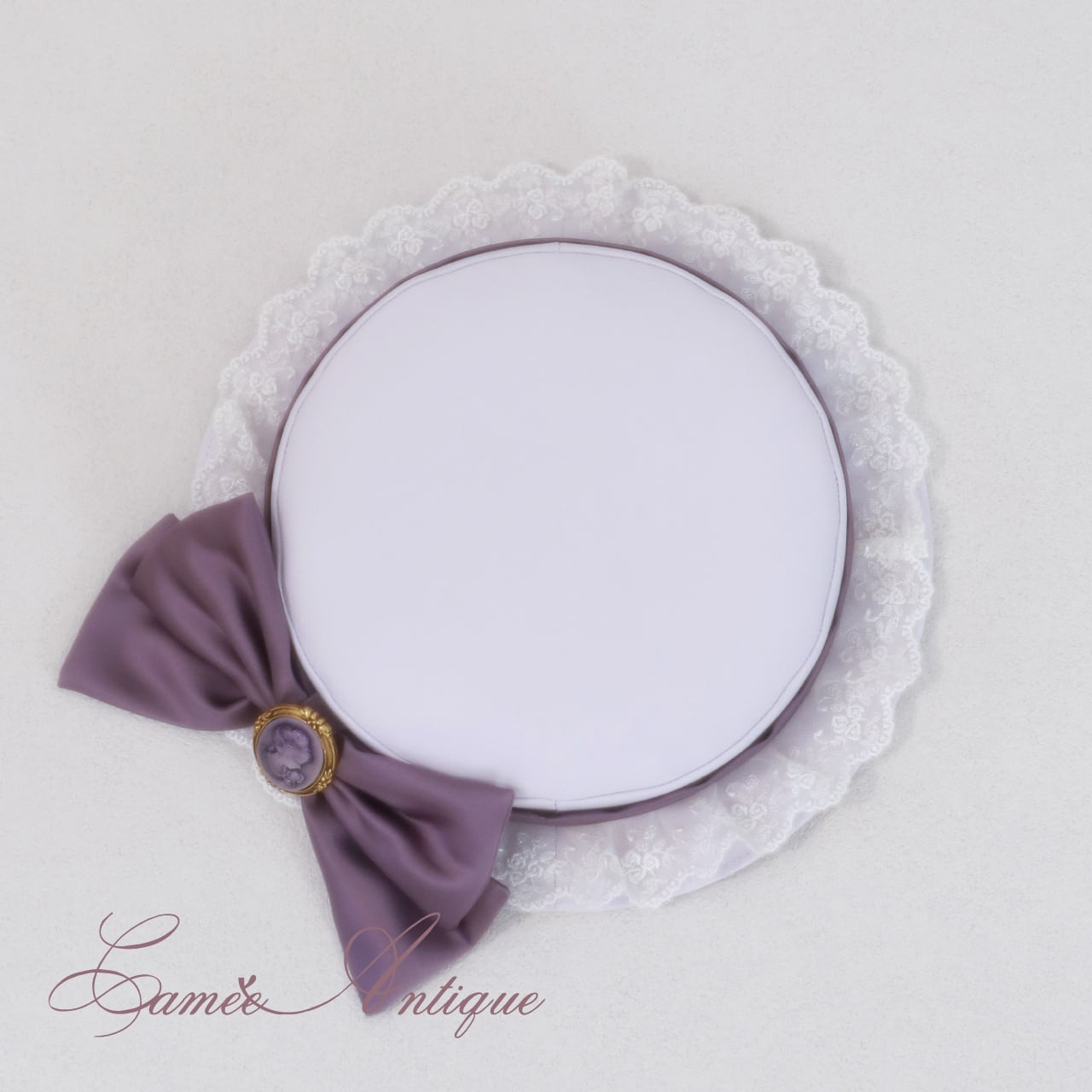 薄いラベンダーのキャノチェに、落ち着いたくすみラベンダーのサテン生地でお作りしたリボンが付くデザイン。リボンの中心にラベンダーのカメオをあしらいました。