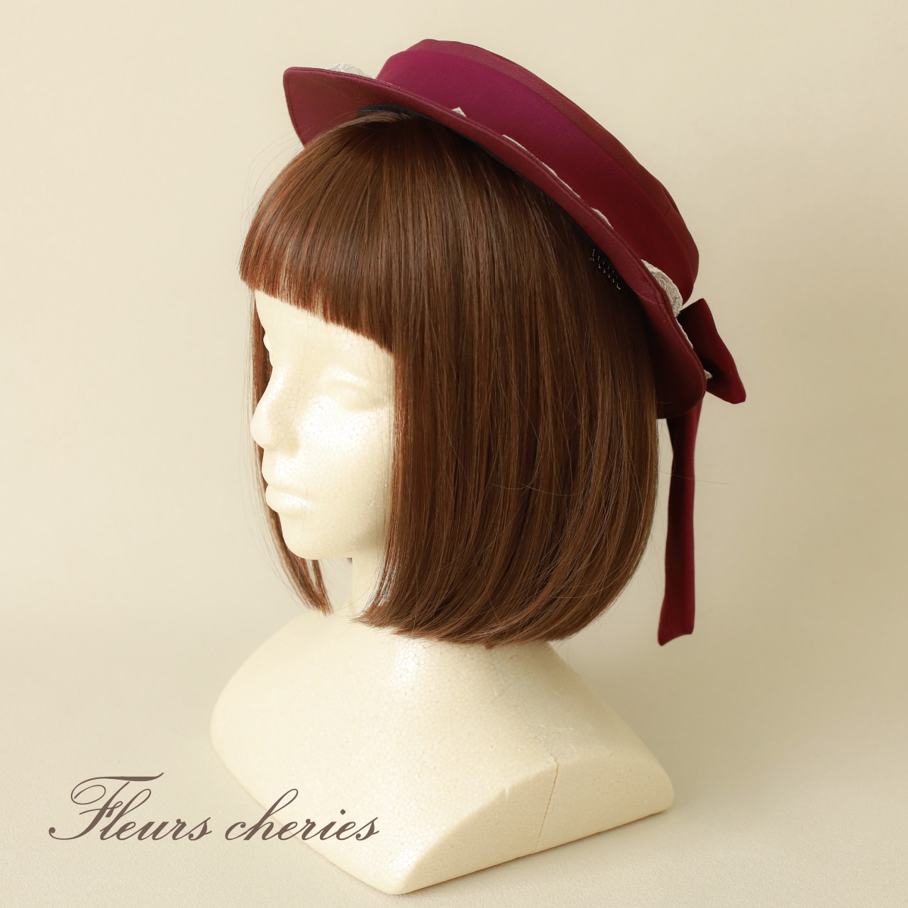ボルドーのキャノチェに、同色生地のリボンが付いたデザイン。