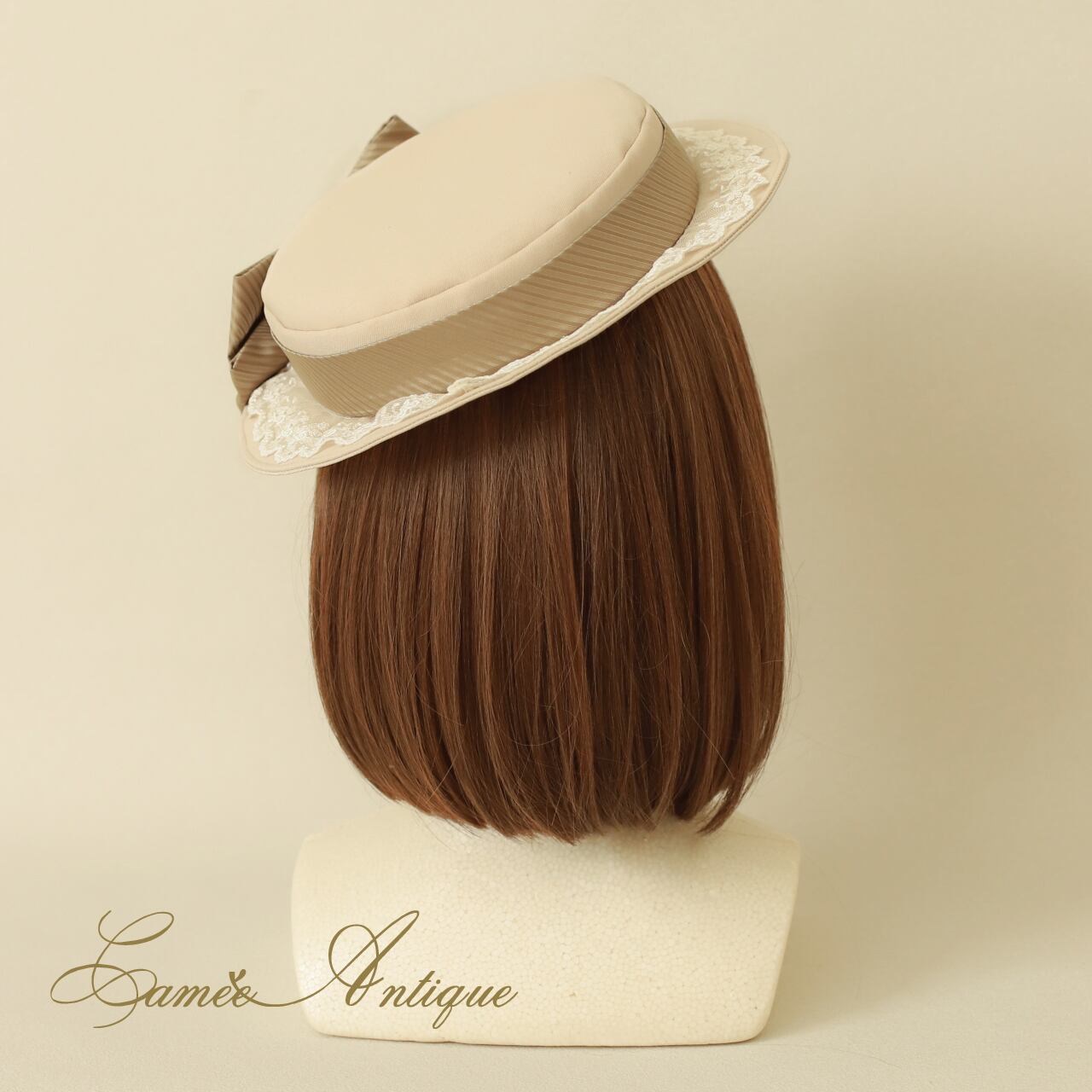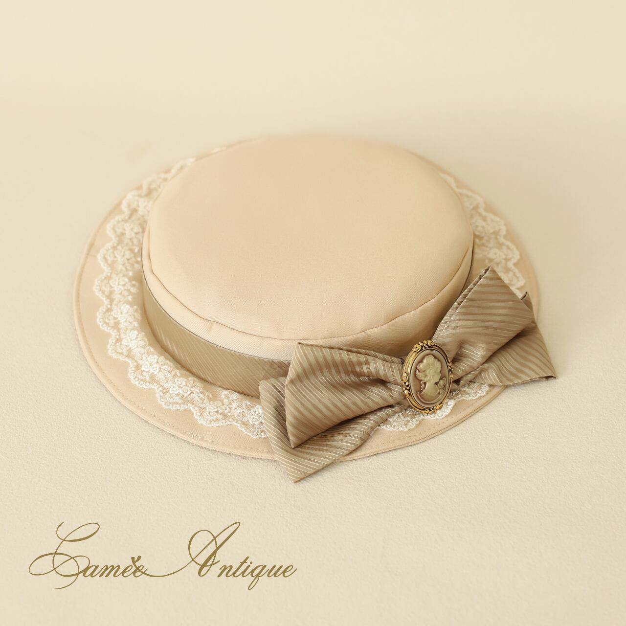 淡いベージュのキャノチェに微配色のストライプ生地のリボンが付いたデザイン。